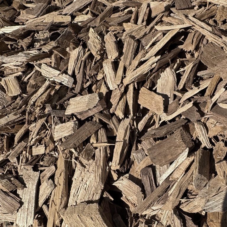 Clean wood chips—no pallets or chipped green wood. Suited for play spaces.