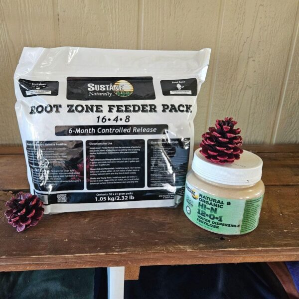 Help your plants thrive with a 50pk of 16-4-8 root feeders for flowers, trees, shrubs and perennials. The bonus 1 lb canister of Sustane 12-0-1, a water dispersible fertilizer, is great for promoting rapid greening and plant growth. Both products will help newly planted or transplanted beauties establish.